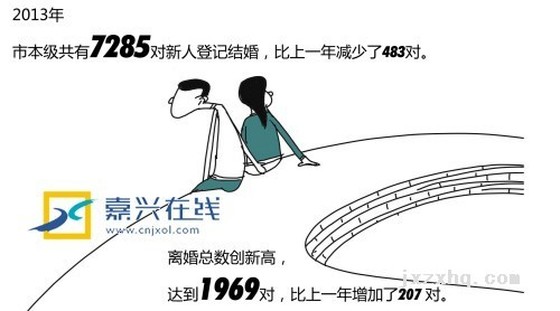 结婚的减少 离婚的增多 要证明自己是单身的更多平均每3.7对新人喜结连理的同时,就有1对夫妻离婚嘉兴在线新闻 2014年01月03日 bc305bcb794814309c6624.jpg (26.68 KB, 下载次数: 0)下载附件 昨天 19:33 上传刚刚过去的2013年,有人欢喜有人愁,有人幸福地走进“婚姻围城”,有人无奈地走出来,或者在“城墙”边彷徨。记者昨天从嘉兴市南湖区和秀洲区民政局婚姻登记处了解到,去年,市本级共有7285对新人登记结婚,比上一年减少了483对,而离婚总数又创新高,达到1969对,比上一年增加了207对。平均每天20对男女结为夫妻去年,嘉兴市本级平