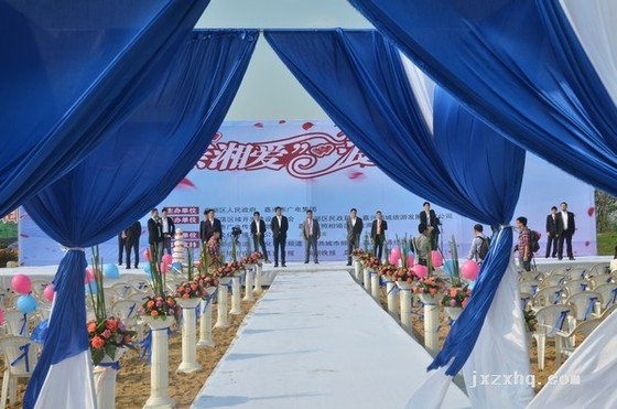 2013年10月20日上午,第一届“相亲湘爱”浪漫婚典之旅在湘家荡湘湖畔的月亮湾沙滩举行,近19对嘉兴新人在湘湖美景的见证下喜结良缘。这场由南湖区人民政府、嘉兴市广播电视集团主办,湘家荡区域开发建设管委会、南湖区民政局、嘉兴市广电传媒有限公司、湘家荡旅游发展有限公司、嘉兴市照相婚庆行业商会承办的集体婚典,是“2013中国·嘉兴湘家荡旅游文化节”的活动之一,在婚礼上,新人们体验了一场具有湘家荡区域特色的浪漫婚典之旅。早上6:00,迎着朝霞,所有新人来到湘家荡内的小木屋里进行准备工作。9:20左右,新人们乘坐花车,在亲
