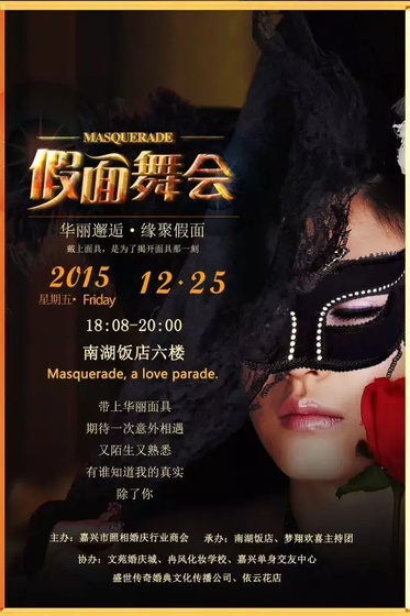 Chrishmas·预告|禾城之夜·圣诞假面舞会火速加载ING禾城之夜·假面舞会“禾城之夜”时间:2015年12月25日晚地点:南湖饭店6楼主题:“圣诞之约”化妆晚会!主办:嘉兴市照相婚庆行业商会承办:南湖饭店、梦翔欢喜主持团协办:嘉兴经典文苑婚庆城、冉风化妆学校、嘉兴单身交友中心、盛世传奇婚典文传播公司、依芸花店。冥冥之中,也许你也在期待一场邂逅,与时光邂逅,与未来的某个人……邂逅。M`asqueradeChrishmas·禾城之夜➤【Part1:签到】嘉宾于活动当天到达南湖饭店6楼《南湖饭店》南湖饭店拥有三十多年历史,伴随着南湖不断闪