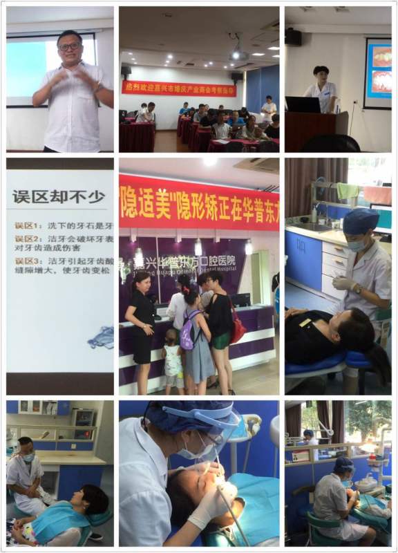2016年8月18日下午,嘉兴市婚庆产业商会组织会员单位17人,参观考察和体验了商会会员单位:华普东方口腔医院,位于嘉兴建国北路706号的华普口腔医院是一家专科医院,有专业牙医8位医生,副主任医师一位.开业巳有12年,医院张园园医生对大家进行PPT科学护理保健牙齿宣传讲解,介绍囗腔保健知识。王铁军总经理热情接待了商会会员,并且提供了价值285元为体验者进行检查洗洁牙服务,会员们一起深切感受到商会大家庭所带来的资源平台对接,很多会员从线上走到了线下互相进行了交流和行业介绍!